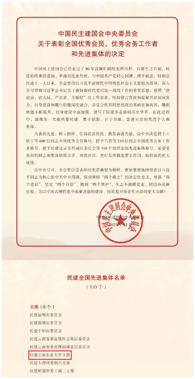 学校民建支部坚持以习近平新时代中国特色社会主义思想为指导,积极贯彻落实中共中央各项决策部署。近年来,支部在民建云南省委的正确领导下,在学校党委的大力支持下,聚焦参政议政与社会服务两大核心职能,取得显著成效。一是参政议政成果丰硕,支部会员围绕农业科技、乡村振兴等领域深入调研,形成调研报告获国务院领导批示1件,工作专报获省委领导批示1件,社情民意获民建中央采纳1件、省政协采纳1件、民建省委采纳7件,为各级决策提供重要参考;二是社会服务扎根基层。依托“农民院士”科技服务站、科技特派员、三区人才等,组织专家团队深入基层一线,开展技术咨询、产业帮扶等服务。累计承担社会服务项目10余项,服务企业2 0余家,直接助力地方农业产业升级和农民增收。