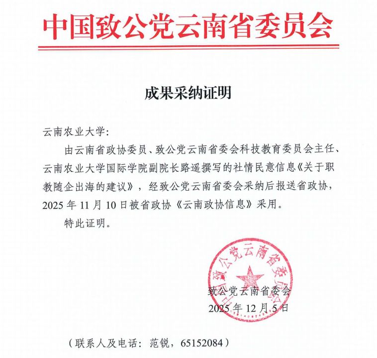 近日,由云南省政协委员、致公党云南省委会科技教育委员会主任、学校国际学院副院长路遥撰写的社情民意信息《关于职教随企出海的建议》,经致公党云南省委会采纳后报送省政协,被《云南政协信息》采用。